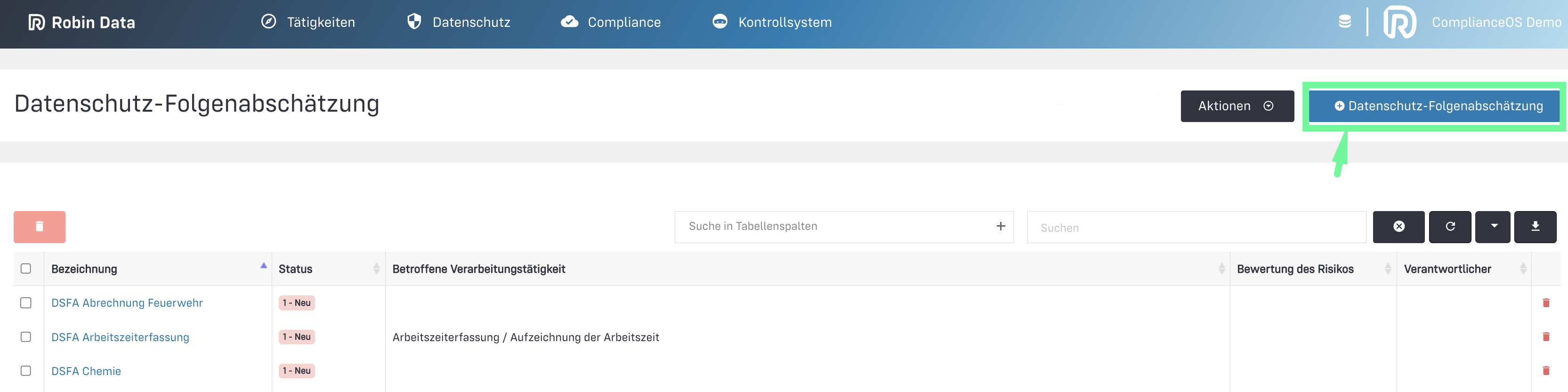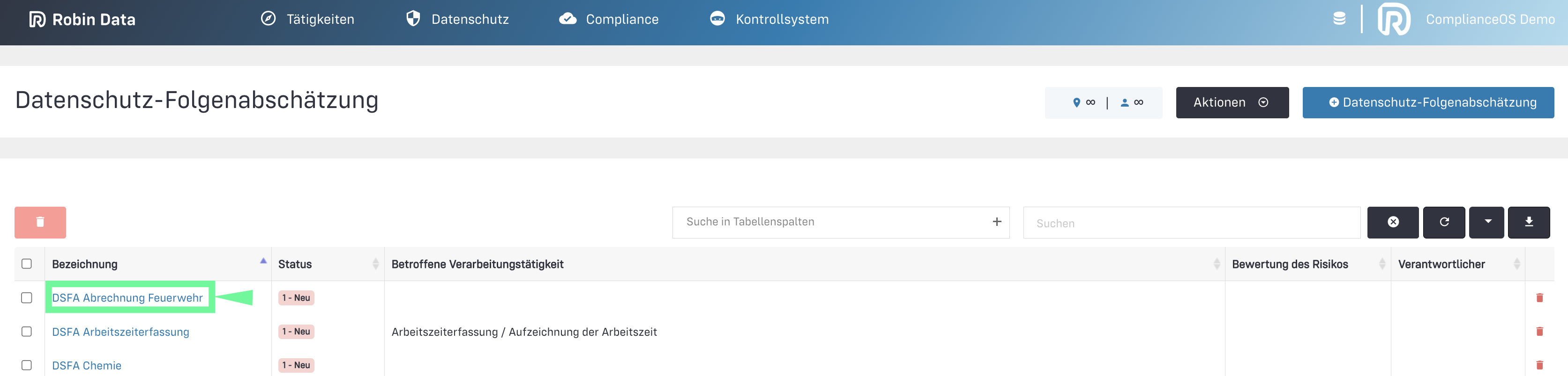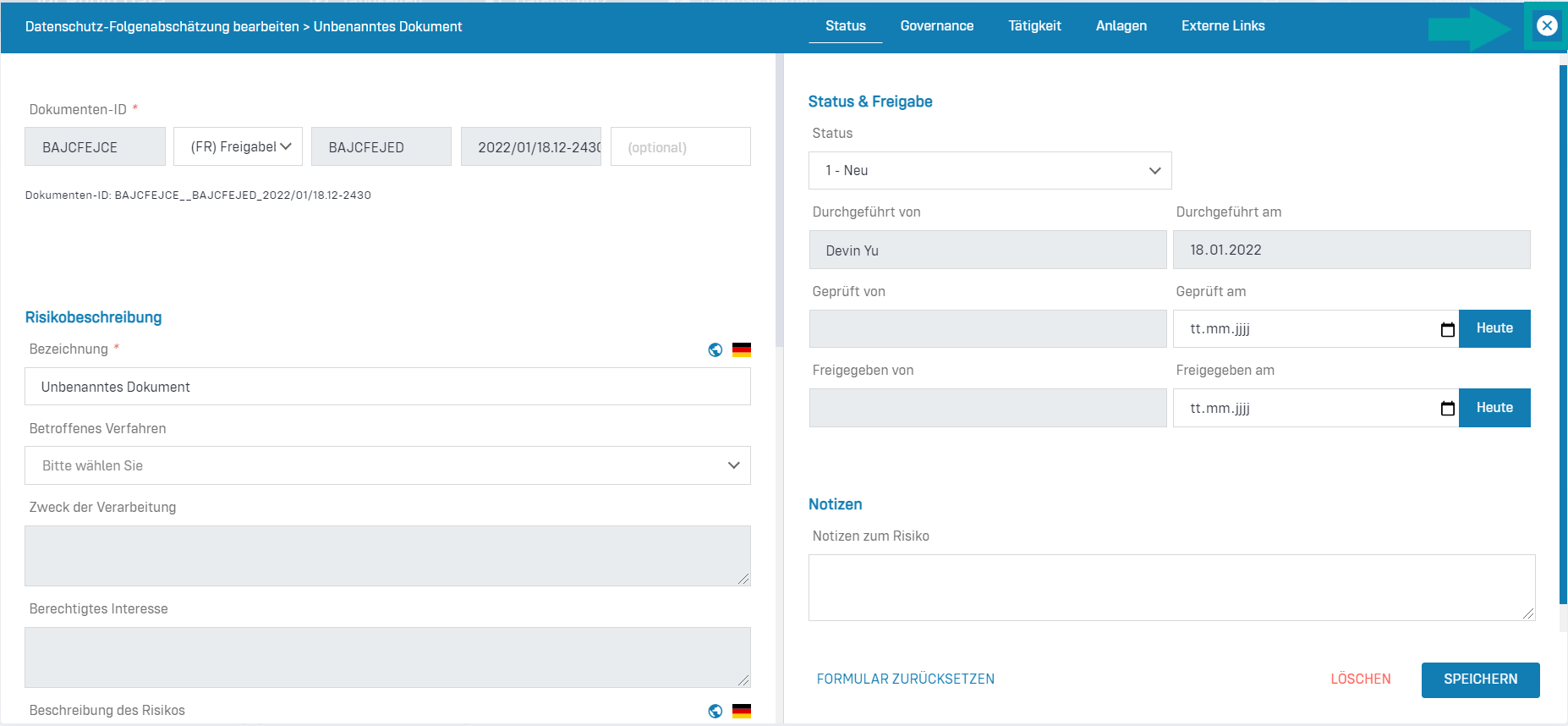 - Status: Geben Sie den aktuellen Bearbeitungsstatus der DSFA an.