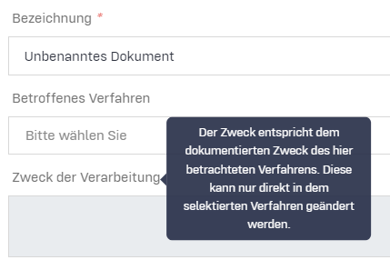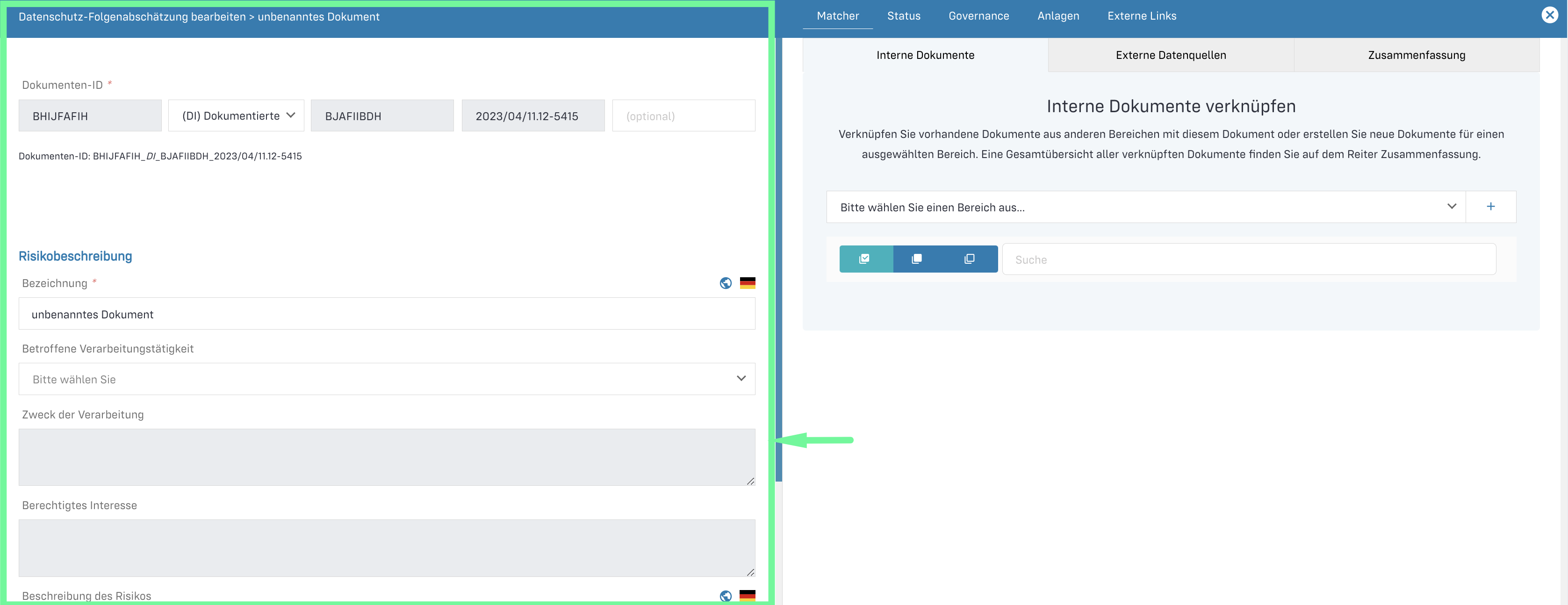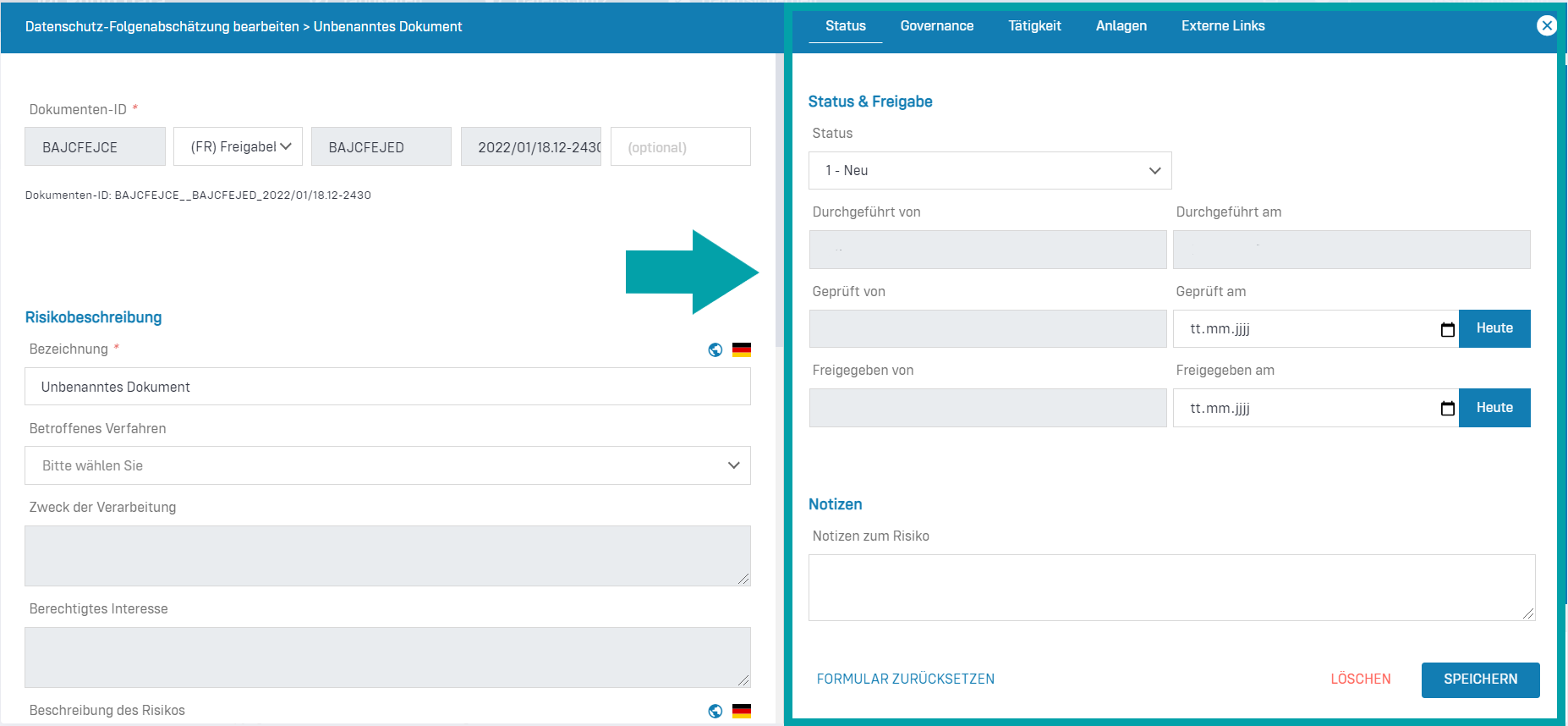 Der rechte Formularbereich dient dazu, zusätzliche Informationen zum Datensatz zu pflegen. Auch im rechten Formularbereich variieren die Felder in Abhängigkeit des zu pflegenden Datensatzes. Im Beispiel "Datenschutz-Folgenabschätzung" pflegen Sie die folgenden Felder im rechten Formularbereich: