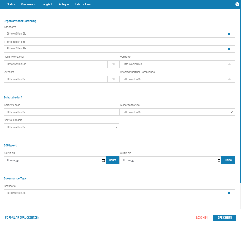 - Governance Tab: Der Governance Tab ist in mehreren Dokumenten in der Robin Data Software gleichermaßen verfügbar. Es bietet die Möglichkeit, diverse grundlegende Parameter für das jeweilige Dokument festzuhalten. Eine nähere Erläuterung dazu finden Sie im Artikel Governance Inhalte verwalten.