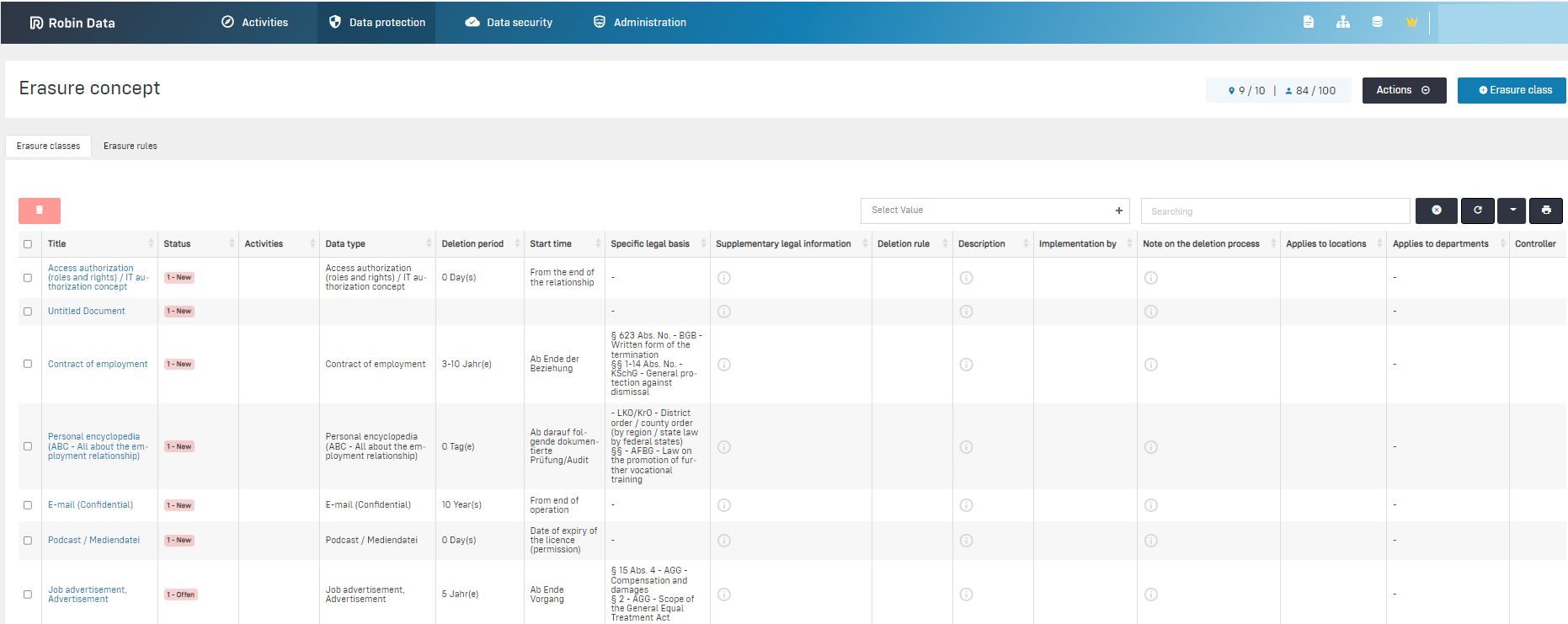 You will then find the generated erasure classes under the menu item Data protection > Erasure concept. You can then adapt these to your needs if necessary.