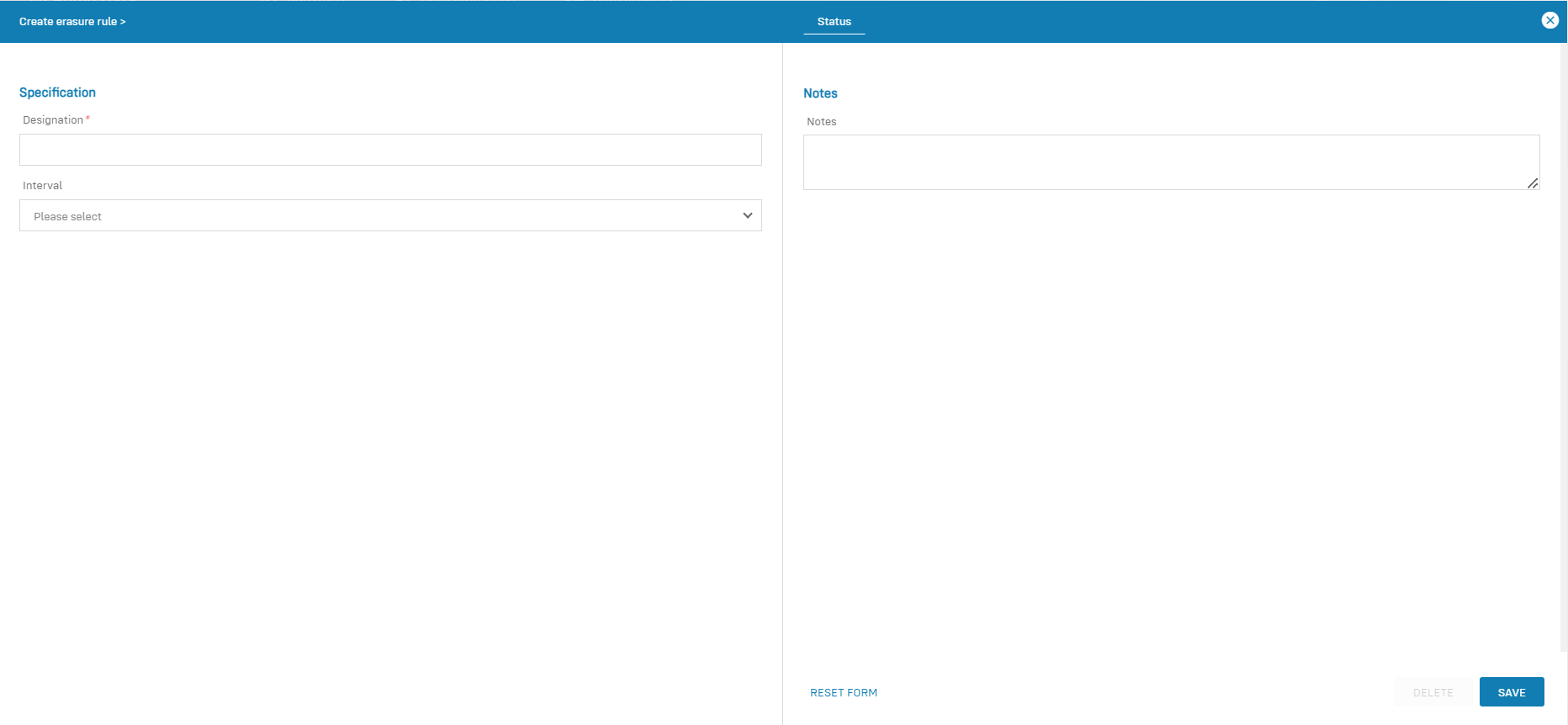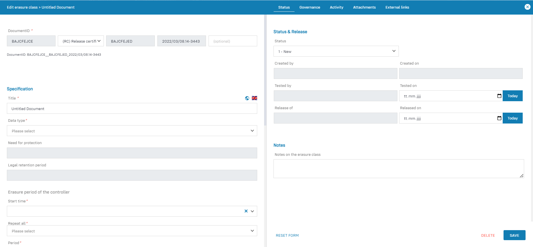 - Status Tab: In this tab it is possible to manage the status of a document and to store notes about the erasure class.