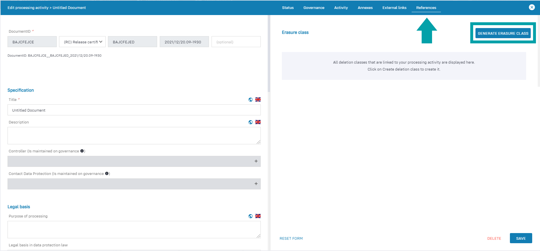 You can generate erasure classes directly from a processing activity at the click of a button. The erasure class is generated based on the data types of the respective processing activity.