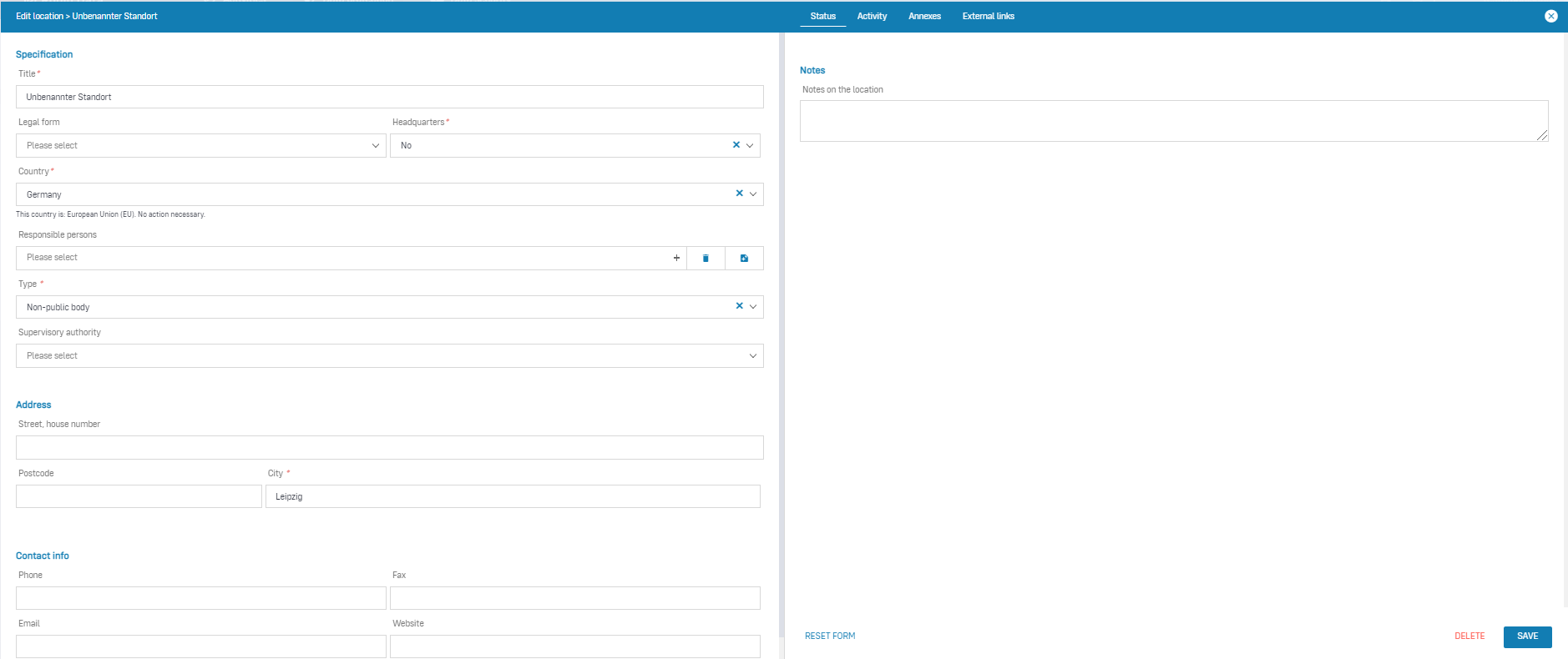 - Type (mandatory field): From a data protection perspective, it is important to specify for each location whether it is a so-called public body or non-public body. Public bodies, at least in Germany, are subject not only to the general data protection regulations (GDPR, BDSG) but also to the data protection regulations of the individual federal states (state data protection law).
