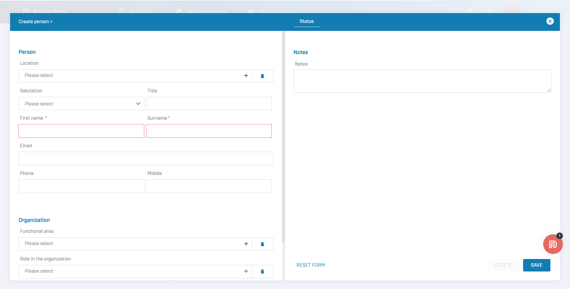 If you only want to create the person at first, but do not want to invite him/her as a user of the Robin Data ComplianceOS® yet, we recommend not to fill in the field email at first.