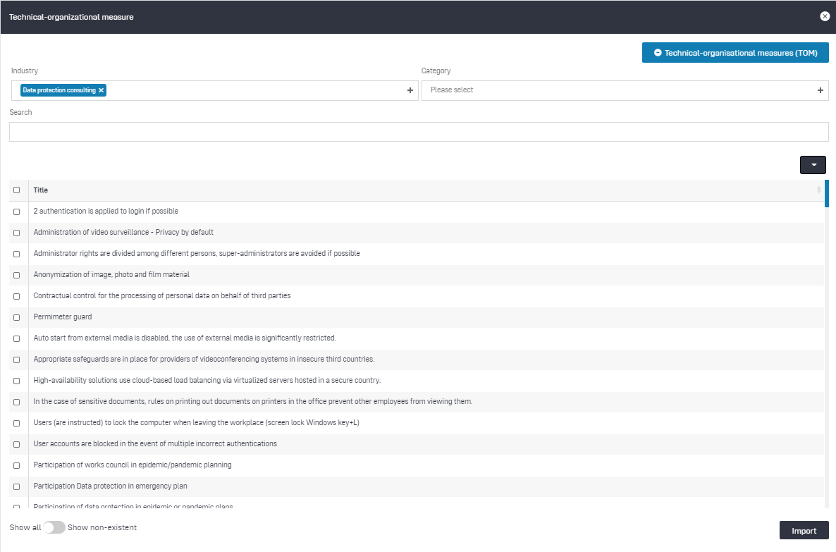 - Import: By clicking on "Import", the TOMs selected via the checkboxes in the table are transferred to your data protection documentation.