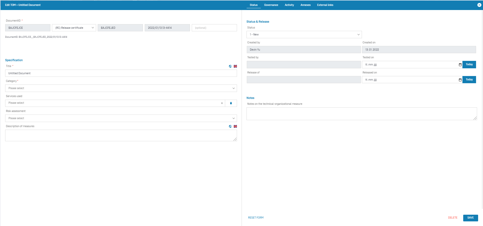 - Governance Tab: The Governance Tab is equally available in several documents in the Robin Data ComplianceOS®. It offers the possibility to record various basic parameters for the respective document. a more detailed explanation can be found in the article Manage Governance Content.