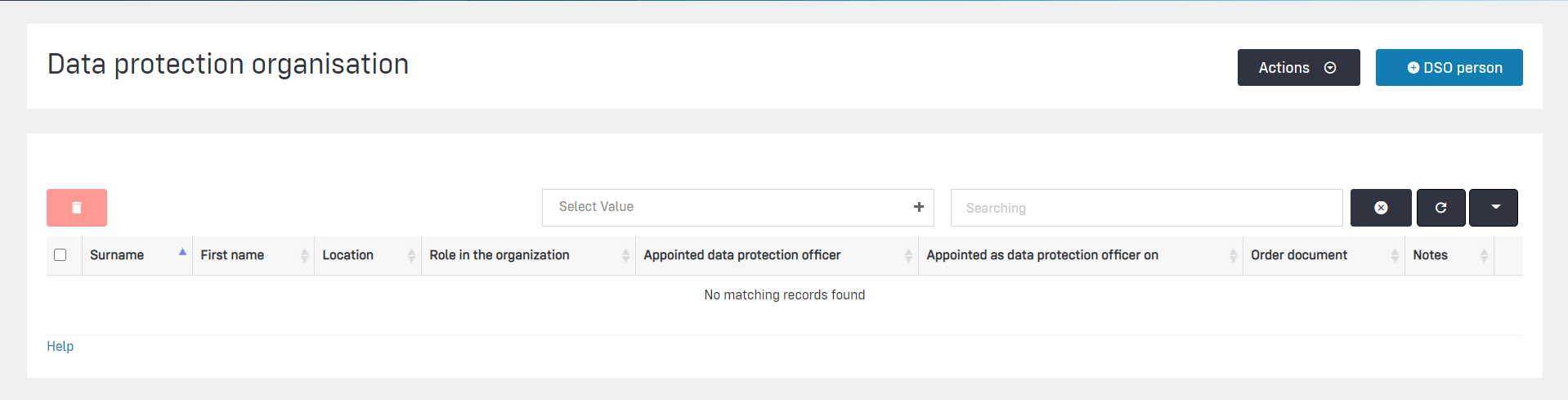 - In the dropdown menu click on Data protection organisation: The table view will open.