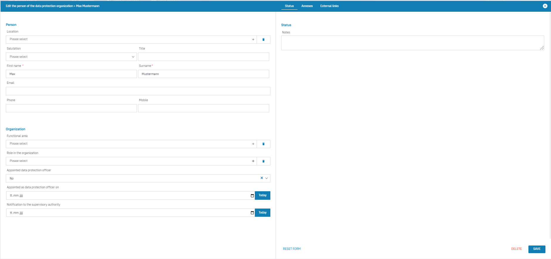 - Organisation: Definition of the function and roles in the data protection organisation for this person.