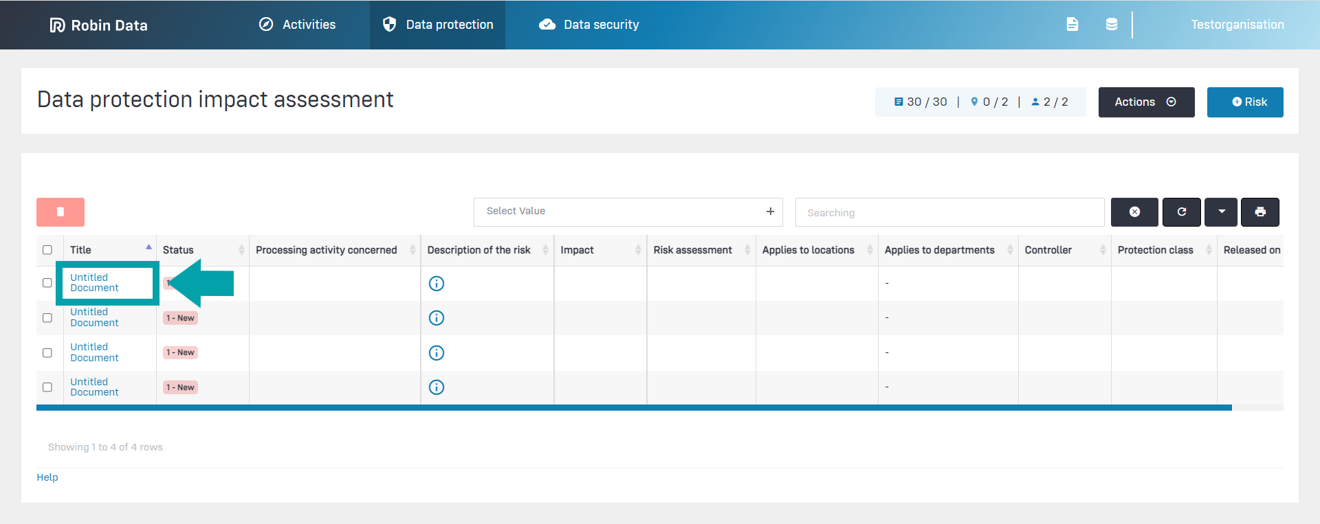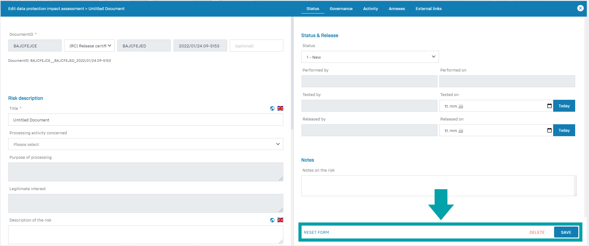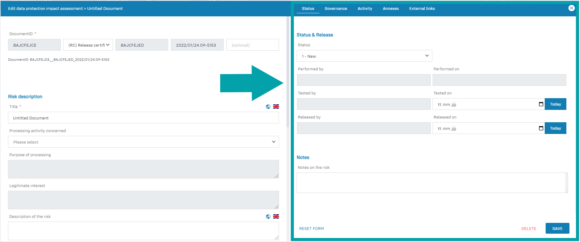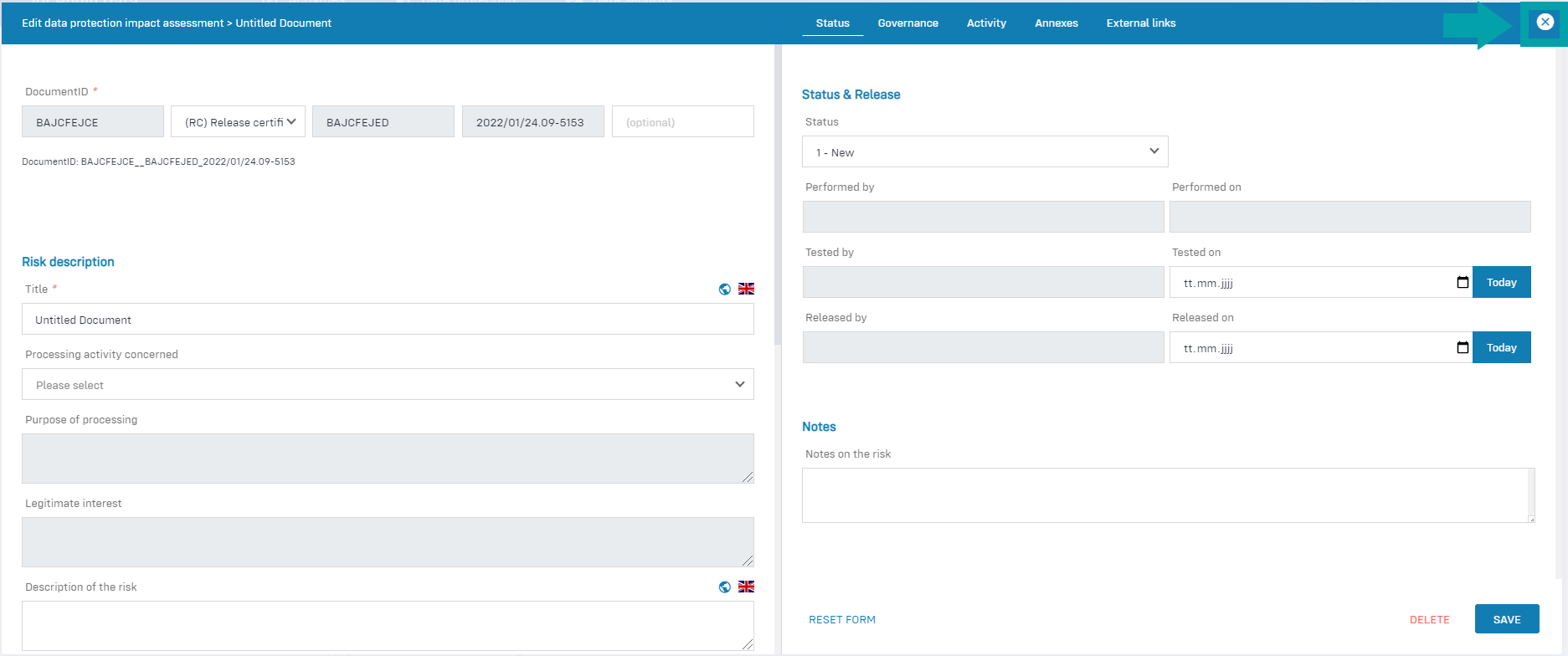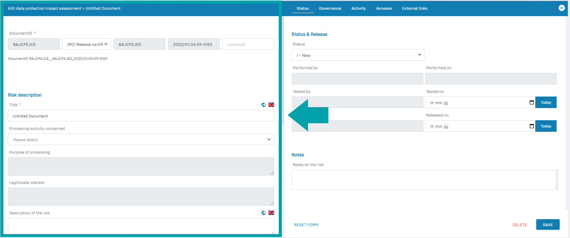 - Risk description: In this area, you define the risk or risks for the processing activity.