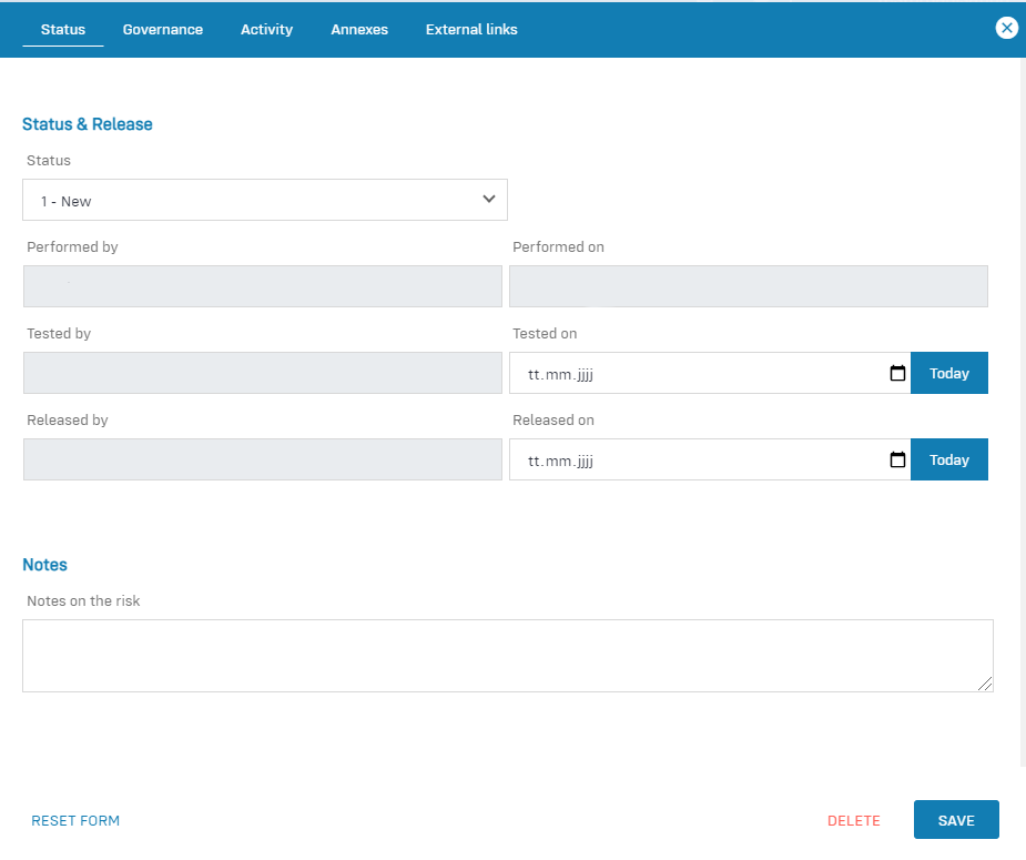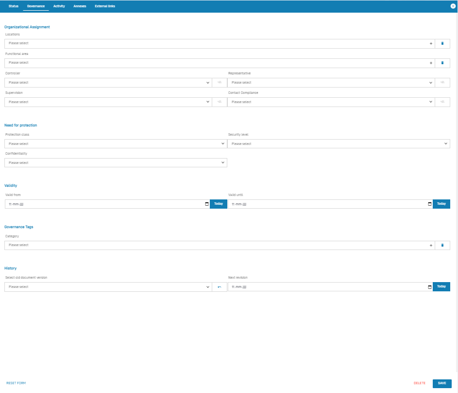 Governance tab: The governance tab is equally available in several documents in the Robin Data software. It offers the possibility to record various basic parameters for the respective document. A more detailed explanation can be found in the article Manage Governance Content.