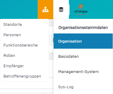 Die Organisationsstammdaten finden Sie in der Hauptnavigationsleiste auf der rechten Seite neben der Bezeichnung Ihrer Organisation. Die Organisationsstammdaten sind mit dem Icon