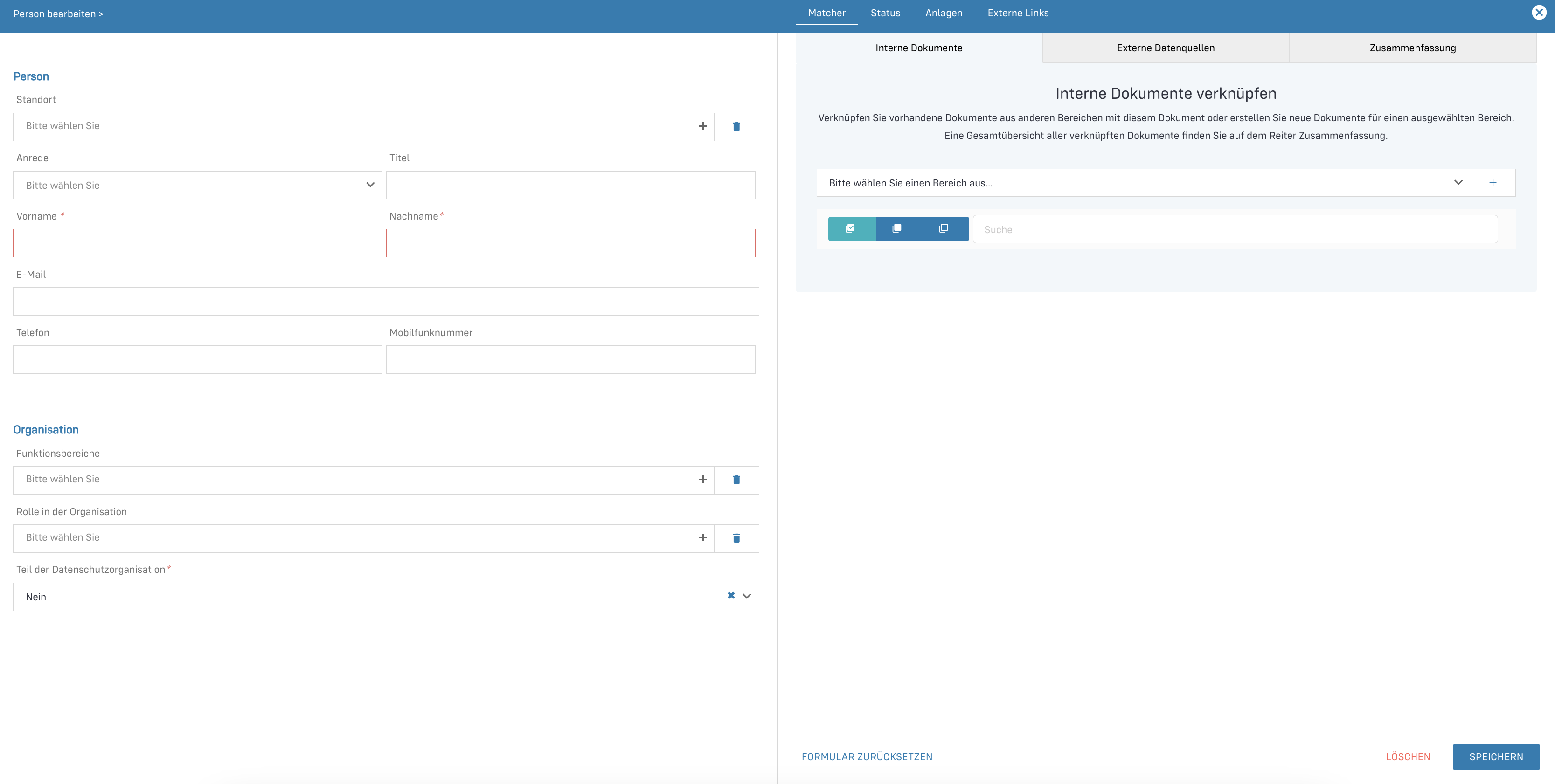 - Matcher Tab: Über den Matcher können Sie Dokumente (wie z.B. Tätigkeiten oder technische und organisatorische Maßnahmen) verknüpfen sowie verknüpfte Dokumente einsehen. Über den Matcher können weitere Dokumente erstellt werden, die mit dem geöffneten Datensatz verknüpft werden können. Eine nähere Erläuterung dazu finden Sie im Artikel Matcher verwenden.
