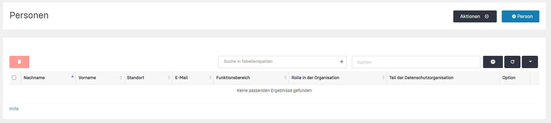 In der Regel interagieren mit der Robin Data ComplianceOS® nur die Nutzer, die Teil der Datenschutzorganisation sind. Dennoch kann es sinnvoll sein, weitere Personen in der Robin Data ComplianceOS® anzulegen. In einer späteren Version wird die Robin Data ComplianceOS® zum Beispiel ein Schulungsmodul enthalten, welches den Start und die Verwaltung von Schulungen auf Basis der Personen der Organisation ermöglicht.