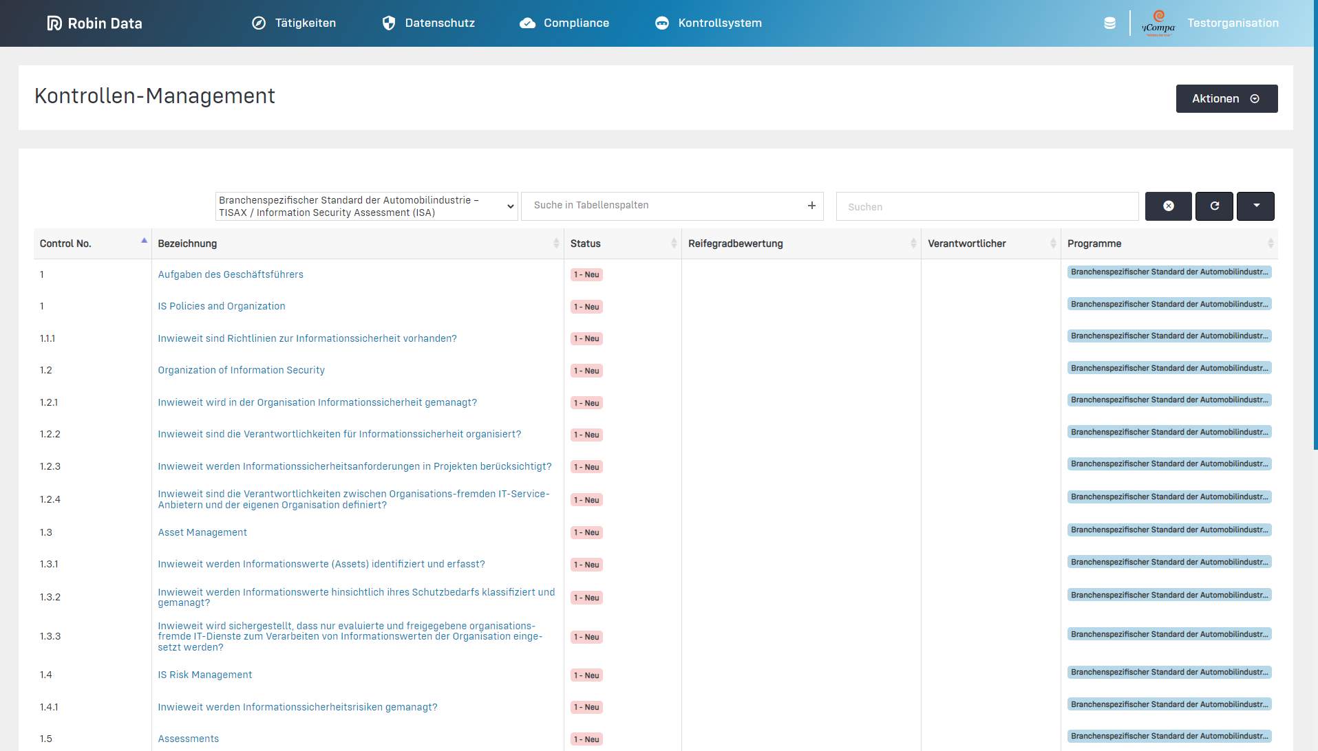 Die Anforderungen an Compliance Lösungen basieren auf nationalen und internationalen Standards, Richtlinien und Gesetzen. Robin Data ComplianceOS® bildet diese in Form von Programmen ab. Von diesen Programmen werden bestimmte Anforderungen, die sogenannten „Kontrollen“, abgleitet.