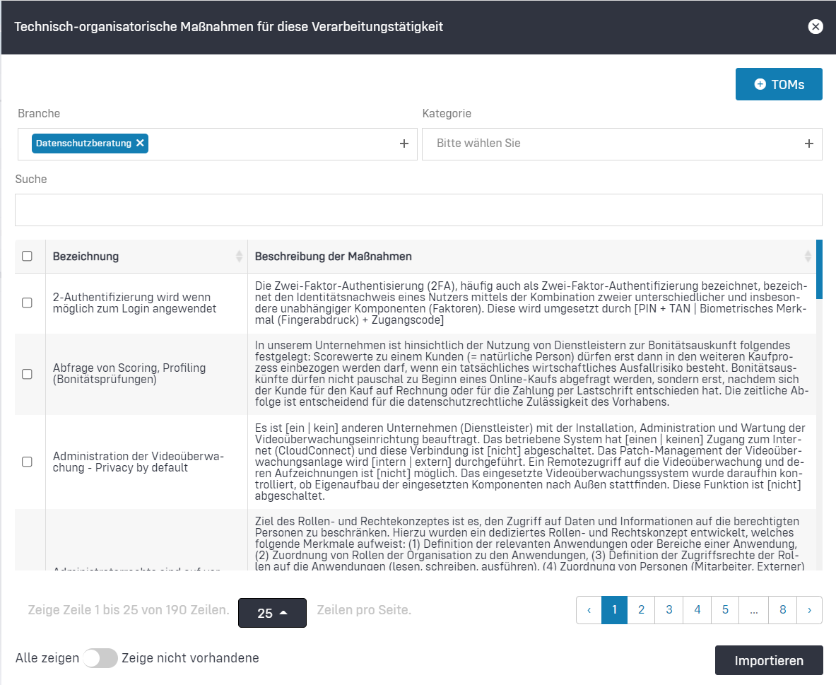 - Importieren: Mit Klick auf "Importieren" werden die über die Checkboxen in der Tabelle ausgewählten TOMs in Ihre Datenschutz-Dokumentation übertragen.