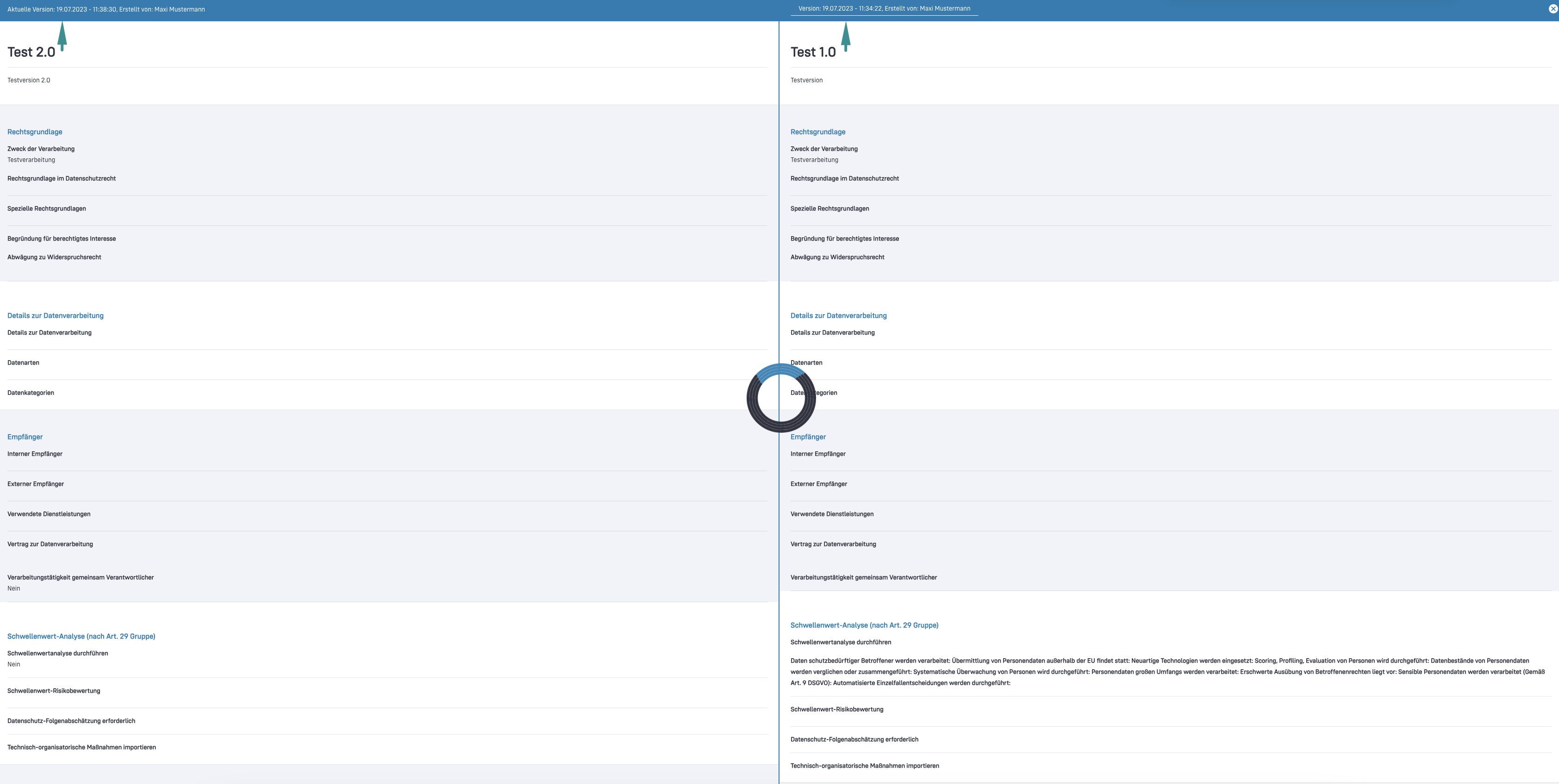 Bei der Wiederherstellung einer Version, werden alle Inhalte wiederhergestellt die sich im linken Bereich sowie unter Status und Governance auf der rechten Seite der Modal befinden. Nicht betroffen von der Änderung einer Versionierung sind die Tabs Tätigkeit, Anlagen, Externe Links und Referenzen.