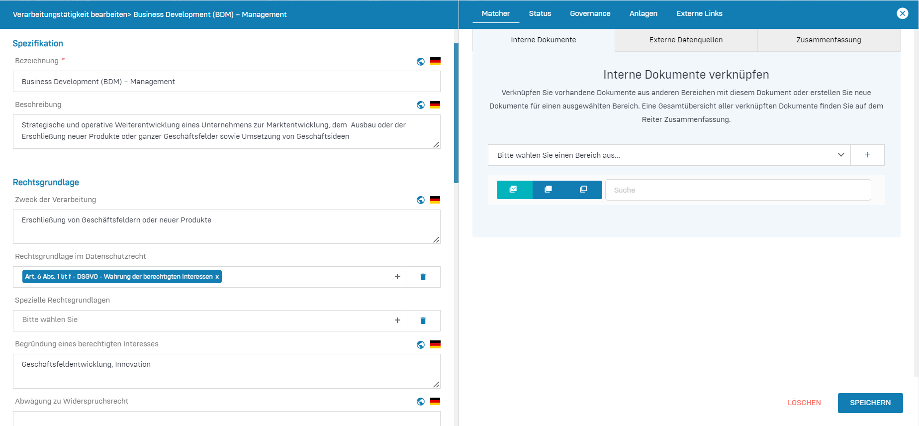 - Datenbereich Rechtsgrundlage: Definieren Sie die Zweckmäßigkeit der Verarbeitungstätigkeit, dessen Rechtsgrundlagen und begründen Sie eigene Interessen zur Nutzung dieser Verarbeitungstätigkeit.
